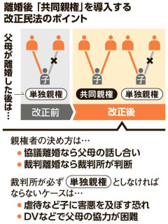 1. 匿名@ガールズちゃんねる 共同親権のもとでは、転居や進学先の決定など子に重大な影響を与える事柄は、父母が話し合って決める。アルバイトの許可など「日常の行為」や、緊急の手術など「急迫の事情」がある時は、一方の親だけで方針を決めることができる。 離婚時に親権をめぐって父母の意見が割れたら、家裁が子の利益の観点から、共同親権か単独親権かを定める。虐待など子の心身に害悪を及ぼす恐れがある場合や、配偶者への家庭内暴力(DV)の恐れから父母が共同して親権を行使するのが困難な場合は、必ず単独親権としなければならない。ただ、家裁がDVなどの危険を見抜ける体制になっているか、懸念する声は消えていない。 すでに離婚している父母についても、共同親権への変更の申し立てが全て認められるわけではない。DVや虐待があれば不可。養育費の支払いを正当な理由なく長期間怠っていた場合なども認められない可能性がある。 2026/03/30(月) 09:50:45…