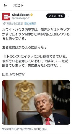 1: 2026/03/30(月) 17:28:47.77 ID:a5tPF1kk0 (ブルームバーグ): トランプ米大統領は27日、ベネズエラやイランに対する軍事作戦に言及する中で「次はキューバだ」と発言した。フロリダ州で開かれたフォーラムで述べた。「だが、今のは聞かなかったことにしてほしい」とも付け加えた。詳細には触れなかった。約1000万人の人口を抱えるキューバでは、政府が慢性的な燃料不足に直面。今月16日には、全国的な停電が発生した。老朽化したインフラに米国による事実上の石油封鎖が追い打ちをかけており、キューバは苦境に追い込まれている。トランプ大統領がキューバ政府への経済的圧力を強め、ベネズエラやイランに続く次の標的になり得ると示唆する中、カルロス・フェルナンデス・デ・コシオ外務副大臣はキューバが軍事攻撃の可能性に備えていると明らかにした。イランはもう飽きた模様 imgur.com/7PH89oD 2: 2026/03/30(月) 17:32:41.51 ID:Keat48R+0 飽きた(勝てない) 3: 2026/03/30(月) 17:42:18.61 ID:R0ft3IY90 信長の野望かな ★よく読まれている記事 【大悲報】「娘にうがいをさせ、汚れた身体をシャワーで洗い流して…」斉藤慎二の被害者の母親が涙ながらに証言 【悲報】重盛さと美「写真集では肛門の赤みを修正せずあえてそのまま出しました」wwwwwwww 【動画】さすらいネキ、変わり果てる… 【画像】髪が伸びる人形、レベチwwwww 【画像】フジテレビの恵体新人美人アナwwwww 【大悲報】世界、なんか急に「もう終わりですよ」感を出し始める 【画像】セブンのおにぎり、もはや米でなくなるwwwwwwwwww 【画像】本田翼(31)、たぬかなになる 【画像】女子小学生「みんなでプールのお掃除したよ」←なぜか10万いいね 【画像】女の子が行為の後にして欲しいことがこちら…