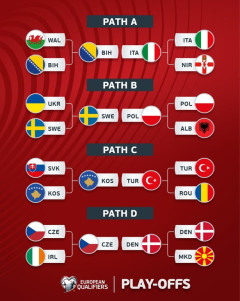 1: 阿弥陀ヶ峰 ★ 2026/03/31(火) 16:29:13.84 ID:jtV/CIXg9 FIFAワールドカップ2026(W杯)欧州予選プレーオフの決勝戦が現地時間31日に行われる 【トーナメント表】FIFAワールドカップ2026 欧州プレーオフ準決勝・決勝 組み合わせ一覧 パスAは3大会ぶりとなるW杯出場を目指すイタリア代表とボスニア・ヘルツェゴビナ代表が対戦 イタリアはボスニアとの直近5試合で4勝1分と好成績を残している。一方で準決勝のウェールズ代表戦で同点ゴールを決めたボスニアのFWエディン・ジェコは、ローマ、インテルなどで活躍しており、イタリアの守備を崩す方法を熟知している。“アズーリ”にとって絶対に目を離してはいけない存在だ パスBはW杯でサッカー日本代表と同じ組に入ることが決まっている 決勝で激突するのはポーランド代表とスウェーデン代表だ。準決勝ではスウェーデンのFWヴィクトル・ギェケレシュがハットトリックを達成した一方で ポーランドのエースFWロベルト・レヴァンドフスキも同点弾を記録。両チームのエースストライカーが活躍した上で勝利しており決勝でもこの2人の活躍に注目が集まる パスCではルーマニア代表を下したトルコ代表と、激戦の末にスロバキア代表を4-3で破ったコソボ代表が激突する 2002年の日韓大会からW杯の出場権を獲得できていないトルコ。ヴィンチェンツォ・モンテッラ監督率いるチームには、DFフェルディ・カディオグル、MFアルダ・ギュレル、FWケナン・ユルディズなど各ポジションにタレントが揃っている。 パスDはデンマーク代表とチェコ代表が本大会の出場権をかけて対戦する。 チェコは、UEFA EURO 2004の準々決勝で勝利して以来 デンマークに5分2敗と負け越している。しかし準決勝ではアイルランド代表に2点リードされながらも追いつき最後はPK戦を制して決勝進出を決めた 対するデンマークも、準決勝では北マケドニア代表を圧倒。4-0と快勝し、決勝の舞台に辿り着いている…