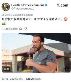 1: それでも動く名無し : 2026/04/01(水) 01:26:04.92 ID:LY6BJEyT0USO 引用元: 【動画】アメリカ強者男性「一日に2回これを食べ、ゲイ🌈を遠ざけろ!🗿」…