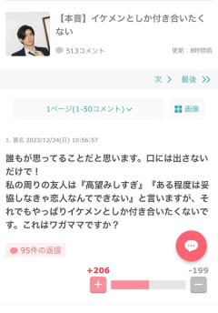 1: 2023/12/31(日) 00:41:59.09 【本音】イケメンとしか付き合いたくない 誰もが思ってることだと思います。口には出さないだけで! 私の周りの友人は『高望みしすぎ』『ある程度は妥協しなきゃ恋人なんてできない』と言いますが、それでもやっぱりイケメンとしか付き合いたくないです。これはワガママですか? ※関連記事 【調査】渋谷女子「こういう服着てる男子イケメン多い!」「こういうの着る彼氏が欲しい」…