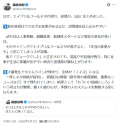 1: 2026/04/01(水) 14:32:28.78 「ほとんど滑ってるよ」テレ東名物記者がエイプリルフール投稿に苦言 長文で理由も説明 テレビ東京の元官邸キャップの名物記者、篠原裕明氏が1日、自身のX(旧ツイッター)を更新。エイプリルフールの投稿にやんわりと苦言を呈し、理由も説明した。 篠原氏は「もうX上の4.1ネタやめてほしい。ほとんど滑ってるよ」と投稿した。 その後、栃木県で最大震度5弱を記録した地震情報について投稿し注意喚起。続けて、「4.1ネタ」について苦言を呈した理由を投稿した。 もうX上の4.1ネタやめてほしい。ほとんど滑ってるよ。— 篠原裕明 (@shino7878shino) April 1, 2026 なぜ、エイプリルフールネタが滑り、迷惑か。2点にまとめました。1️⃣新年度初日でさまざま変更があるなか、誤情報を信じ込みやすい 4月1日は人事異動、組織変更、新制度スタートなど現実の変化が多い日。… — 篠原裕明 (@shino7878shino) April 1, 2026 ※関連記事 なぜエイプリルフールは終わコン(終わったコンテンツ)になったのか?…