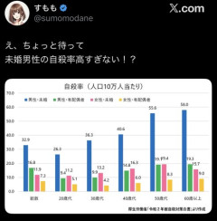 1: 2026/03/31(火) 12:43:57.74 ID:gnbXph1b0 imgur.com/FXxIakg 2: 2026/03/31(火) 12:45:21.86 ID:zOmTM3Mi0 自然淘汰やろ 3: 2026/03/31(火) 12:45:34.69 ID:bFaX9/Ii0 まぁなんやかんや言っても男性が未婚な理由で一番大きいのは経済力だからな貧困層が自殺しやすいのは当然っちゃ当然 ★よく読まれている記事 【大悲報】「娘にうがいをさせ、汚れた身体をシャワーで洗い流して…」斉藤慎二の被害者の母親が涙ながらに証言 【悲報】重盛さと美「写真集では肛門の赤みを修正せずあえてそのまま出しました」wwwwwwww 【動画】さすらいネキ、変わり果てる… 【画像】髪が伸びる人形、レベチwwwww 【画像】フジテレビの恵体新人美人アナwwwww 【大悲報】世界、なんか急に「もう終わりですよ」感を出し始める 【画像】セブンのおにぎり、もはや米でなくなるwwwwwwwwww 【画像】本田翼(31)、たぬかなになる 【画像】女子小学生「みんなでプールのお掃除したよ」←なぜか10万いいね 【画像】女の子が行為の後にして欲しいことがこちら…