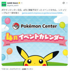 1: 2026/04/01(水) 16:54:04.49 ポケモンは3月31日、全国のポケモンセンター各店舗において、4月1日より4月30日にかけて開催予定だったイベントを中止すると発表した。 ポケモンセンターは、通常であれば「ポケモングリーティング」や「ポケモンカードゲーム教室」といったイベントが開催されるが、3月31日に各店舗のスタッフボイスが一斉更新され、「ポケモンカードゲーム シティリーグ」および「『ポケモンGO』部門ポケモンセンター予選大会」を除く全てのイベントを中止すると発表した。 また「『ポケモンGO』部門ポケモンセンター予選大会」は一部運用を変更し、会場内での対戦模様の放映は行なわれないほか、会場内での観戦もできず、予定していた観戦者への記念品のプレゼントも中止となっている。 ポケモンセンター全店、4月に開催予定だったイベントを中止。シティリーグなど一部を除く pic.twitter.com/SmM3mUokEc— GAME Watch (@game_watch) April 1, 2026 ※関連記事 ポケモンセンター女性刺殺犯、元交際相手だった。一目惚れしたチー牛の犯行ではなかった模様…