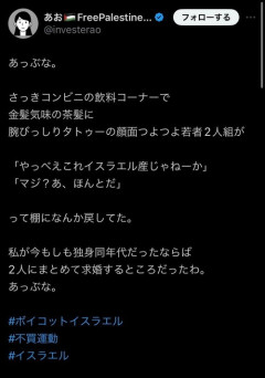 1: 2026/04/02(木) 17:44:08.37 あっぶな。さっきコンビニの飲料コーナーで金髪気味の茶髪に腕びっしりタトゥーの顔面つよつよ若者2人組が「やっべえこれイスラエル産じゃねーか」「マジ?あ、ほんとだ」って棚になんか戻してた。私が今もしも独身同年代だったならば2人にまとめて求婚するところだったわ。あっぶな。…— あお🇵🇸FreePalestine🕊️ (@investerao) October 30, 2024 ありえない嘘松さん pic.twitter.com/4bl7wWu8rZ— ネットのホンモノ図鑑 (@alchemy42x42) April 1, 2026 ※関連記事 【画像】この漫画の「ダメ人間」と付き合っている彼女の話、少し怖くて草wwwww…