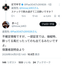 1:2026/04/02(木) 18:43:21.96 ID:Ik8g3bZo0不確定情報ですが、一部証言では、操縦時、酔ってる風だったってのも出てるみたいですよ。保護者説明会より— きーこ (@hirose_kiKO) March 31, 2026さすがに嘘だろ!?平和丸船長諸喜田タケル事件当日の船操縦時、酔っていた!?※ 同志社国際高校保護者説明会よりいやいやいやいやいや………共産党さん記者会見まだですかー??? pic.twitter.com/4b8zIN44mi— だでやで (@Pae3OrE7v261026) April 1, 2026転載元スレッド:…
