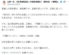 中道前衆院議員、「落選した政治家は、資金難」 支援呼びかけも「働いて」の声