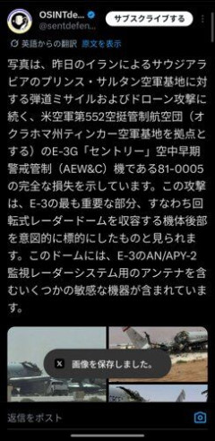 1: 2026/03/29(日) 13:15:56.14 ID:91BonwM/dNIKU うわぁ⋯ imgur.com/JrPcjTn imgur.com/988entA imgur.com/qe7Q2tt imgur.com/eko1vea 2: 2026/03/29(日) 13:30:24.98 ID:EBj8CFeB0NIKU あの変な円盤付いてる飛行機やったのか 流石イラン 3: 2026/03/29(日) 13:33:29.99 ID:jiujWZik0NIKU ググったらE-3Gって製造終了品で1800億円ぐらいか ★よく読まれている記事 【画像】ドイツの水着少女、14歳でこの発育具合 【衝撃】セクシービデオでたまに見るスケスケのセーラー服wwwww 【動画】JSプロレスラー、レベチwwwww 【画像】この40代女性とイチャイチャしろと言われたらできる? 【朗報】もう中学生(43)と結婚したタレント(32)、美人すぎるwwwwwwwwwwwwww 【疑問】日本人って女優はいても、女優を超えた女優はおらんよなwwwwww 【画像】まいんちゃんこと福原遥ちゃん最新のお姿、可愛すぎる 【悲報】形成外科医「乳液や化粧水で肌はキレイにならない。ほとんどがマーケティングです」wwwwwww 【画像】こんなお尻で爆買いする、セクシーセレブ現るwwwwwww 【画像】トップVtuber「月額10万円であなたの彼女になるよ」…