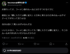1: 26/04/02(木) 11:16:43 ID:Gfxk ええんか?6: 26/04/02(木) 11:18:34 ID:Dp11たしかに2: 26/04/02(木) 11:17:21 ID:6LqOそんな面倒なラーメン屋にわざわざ行かないけど……7: 26/04/02(木) 11:18:51 ID:TMkc>>2郷に従いたくないなら郷に入らない、ってだけやな3: 26/04/02(木) 11:17:52 ID:reKw二郎はラーメンじゃない定期5: 26/04/02(木) 11:18:32 ID:coT8ワイはケチつけてないからセーフ -->…