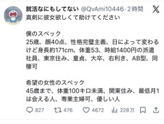 1: 2026/04/04(土) 20:03:22.46 真剣に彼女欲しくて助けてください僕のスペック25歳、顔40点、性格完璧主義、日によって変わるけど身長約171cm、体重53、時給1400円の派遣社員、東京住み、童貞、大卒、右利き、AB型、同棲可希望の女性のスペック45歳まで、体重100キロ未満、関東住み、最低月1は会える人、専業主婦可、優しい人— 就活なにもしてない (@QvAmi10446) April 4, 2026 ※関連記事 【画像】ガチのマジでリアルすぎる「弱者男性の姿」が漫画にされてしまう…