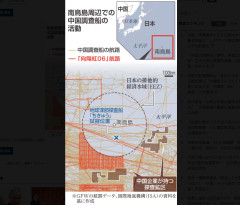 1: 名無し 2026/04/05(日) 08:50:42.15 ID:rE4rEs0s0 南鳥島沖の日本の排他的経済水域(EEZ)周辺で、中国が継続的に海洋調査を実施していることが、船舶自動識別装置(AIS)のデータ分析などで分かった。 活動範囲はEEZの外側の南半分に集中しており、EEZの境界線をなぞるような軌道で探査を実施しているケースも判明している。 同海域では日本の探査船「ちきゅう」がレアアースを含む泥の試掘に成功したばかりだが、中国側も周辺で「マンガンノジュール」の大規模採鉱を計画するなど、実質的な〝包囲網〟が敷かれている実態が浮き彫りになった。 産経新聞 ■要約 ・中国の海洋調査船が南鳥島沖EEZの境界付近で活動を活発化させている ・データ分析により延べ10隻を超える中国船の継続的な活動が確認された ・活動エリアは日本のレアアース試掘成功海域を囲むような南半分に集中 ・公海での調査自由を盾に境界線ギリギリを狙った探査も行われている ・中国企業は周辺海域でレアメタル採鉱の大規模計画を進めている 【悲報】木村拓哉さん、すき家のCMで豪快な「迎え舌」をしてしまう 【速報】 石破がヒトデナシを集めて超党派『人道にもとる外交議連』を発足 全員スパイw 【闇】 渋谷スクランブル放火犯「日本はほぼ乗っ取られています」←これ……