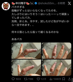 【悲報】中川翔子さん、指切断の危機