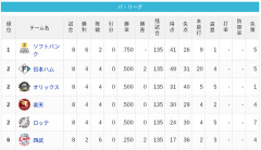 1: 名無しさん 2026/04/04(土) 19:34:29.96 ID:4ZC8ubtA00404 1位 ソフト 6-2 2位 ハム 4-4 2位 オリ 4-4 2位 楽天 4-4 2位 ロッテ 4-4 6位 西武 2-6…