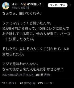 【悲報】オタク「ファミマで1番くじに並んでたら後から来た客に先に引かれて上位賞抜かれた。絶対に許さない」→炎上wwwwwwwwww