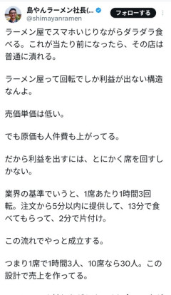 192 名前:名無しさん必死だな [] 投稿日:2026/03/31(火) 13:33:42.95 ID:4gNyhKME0 ラーメン屋は13分以内に食べ終わって2分で退店しないと利益出ないそうです(´・ω・`) 気を付けようね 199 名前:名無しさん必死だな [sage] 投稿日:2026/03/31(火) 13:36:43.84 ID:L93/eH5+0 >>192 子供がまだ食ってる途中でしょうが! 203 名前:名無しさん必死だな [sage] 投稿日:2026/03/31(火) 13:37:53.27 ID:knHjJKHg0 猫舌だからラーメンそんな早く食べれないよぉ(´・ω・`)ハフンハフン 212 名前:名無しさん必死だな [] 投稿日:2026/03/31(火) 13:41:53.39 ID:6rwDzxKV0 >>192 幸楽苑みたいな家族連れ狙いのチェーン店ならともかく 駐車場のないような狭めの店なら確かにこのくらいの時間感覚ですね(´・ω・`) 220 名前:名無しさん必死だな [] 投稿日:2026/03/31(火) 13:45:08.81 ID:Y7yskMqw0 >>192 店舗にそう表示すればいいんですよ 潰れちゃうのでさっさと食べて出て下さいねって(´・ω・`) 241 名前:名無しさん必死だな [sage] 投稿日:2026/03/31(火) 13:49:43.09 ID:jJ2JgnUw0 >>192 量減らそ(´・ω・`) 250 名前:名無しさん必死だな [] 投稿日:2026/03/31(火) 13:51:37.39 ID:ERUcZxGcM >>192 潰れちゃえばいいとおもーよ(´・ω・`) 284 名前:名無しさん必死だな [sage] 投稿日:2026/03/31(火) 14:00:09.22 ID:wUGUk/sV0 >>192 こんな店側の御託並べられたって知らんがなってなもんですよ でもですね 店で飯食いながらスマホはあれどうなんですかね?なんか不味そうってか味わかんのかな?バーっと食っちゃってからスマホみたらどうなんすかね?(´・ω・`) チャーシューの正解: 喜多方ラーメン坂内 様ちゃん飯 日本のヤバイチェーン店posted with AmaQuick at 2026.04.03ぬこー様ちゃん(著) (2025-08-07T04:13:06.530-00:00)Amazon.co.jpで詳細を見る らーめん再遊記(14) (ビッグコミックス)posted with AmaQuick at 2026.04.03久部緑郎(著), 河合単(著)小学館 (2026-01-30T00:00:00.000Z)Amazon.co.jpで詳細を見る…