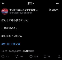 【悲報】中日ドラゴンズ(チュニドラ)ファンさん「なんかもういいわ。一気に冷めた。」