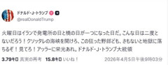272: 名無し 2026/04/05(日) 21:12:33.84 ID:Ngd/opDy0 ヅラの日記帳 Tuesday will be Power Plant Day, and Bridge Day, all wrapped up in one, in Iran. There will be nothing like it!!! Open the Fuckin’ Strait, you crazy bastards, or you’ll be living in Hell - JUST WATCH! Praise be to Allah. President DONALD J. TRUMP…