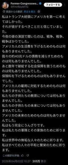 1: 2026/04/05(日) 07:37:47.79 ID:riIJD5H/r ~予算が増えるもの~■軍事費の増額: 国防関連の予算を約44%増の1.5兆ドルに引き上げ、過去最大規模とする提案。~予算が減らされるもの~■非国防支出の削減: 住宅、教育、気候変動対策関連プログラムから約730億ドルの削減提案。 ■EPA(環境保護局): EPAの予算を半分近く削減し、環境正義プログラムや気候関連研究を廃止する方針。■NASA(航空宇宙局): NASAの予算を23%削減(約56億ドル削減)。■NIH(国立衛生研究所): 50億ドルの削減(がん研究やアルツハイマー病研究への影響が懸念されている)。■食糧支援: 「マクガバン・ドール食糧教育プログラム」や「フード・フォー・ピース(Food for Peace)」の削減・廃止。WIC(妊婦・低所得家庭向け栄養支援)の果物・野菜給付の削減。教育・研修: Job Corps(若者向け職業訓練)の完全廃止提案、K-12(幼稚園~高校)プログラムから85億ドルの削減。■高等教育: 歴史的黒人大学(HBCU)の予算削減。■住宅・コミュニティ開発: コミュニティ開発金融機関(CDFI)基金の削減、住宅支援(HUD)の削減。 2: 2026/04/05(日) 07:43:15.56 ID:JtCx7CCx0 これ半分北朝鮮やろ 3: 2026/04/05(日) 07:38:50.46 ID:uRpCZ9qT0 なんやこれ国を貧しくするために戦争するんか?🤔 ★よく読まれている記事 【悲報】坂口杏里さん(35)、300円のサンドイッチを万引きして逮捕 【悲報】立ちんぼ女性、112人も逮捕される 【画像】フィギュア女子「飲みに行くわよ」←誰と行くか選べ 【動画】人気グラビアアイドルの、撮影風景がセクシーすぎると話題に 【動画】バイク女子さん、対向車線にはみ出し死亡… 【画像】声優・水瀬いのりさん(30)の最新画像がガチでヤバすぎる 【画像】山梨学院女子ホッケー部の新2年生、レベチ 【画像】喫茶店の女店員さん、巨パイすぎて客が殺到 【画像】特撮のヒロインが水着グラビアをやる理由 【画像】明日花キララさん、元ボクシング日本王者(163cm)とXでガチのレスバをしてしまう 【悲報】前田敦子さん、離婚理由を「体力がありすぎて夫がついてこれなかった」と告白してしまう 【正論】女さん「Suica残高5000円未満のオスはハズレ確定」 【画像】ギャル女子小学生、卒業する 【画像】NO.1グラビア声優・井口裕香さん、また青年誌でえちえちボディを披露してしまう 【画像】前田敦子さん、毛無ではなくボーボーだった…