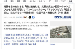 1 : 精算を求められると「親に連絡しろ」父親が支払い拒否…ネットカフェを丸1日利用して「ロースカツカレー」「ミックスピザ」「月見うどん」注文するも…所持金1円 住居不定・無職の男(44)逮捕 4日、島根県松江市でネットカフェを利用したにも関わらず利用料などを支払わなかったとして、住居不定・無職の男が逮捕されました。 詐欺の疑いで逮捕されたのは住居不定・無職の44歳の男です。 松江警察署によりますと、男は2日午後2時44分ごろから3日午後3時40分ごろまでの間、松江市のネットカフェを利用したものの、施設利用料や飲食代金(合計約2万1800円)を支払わなかった疑いが持たれています。 男の滞在が24時間を超えたため店員がいったん精算を求めたところ、男が「親に連絡しろ」と言ったため、店長が父親に連絡すると、父親が支払いを拒否しました。 店長が男にその旨を伝えると「警察を呼べ」と言われ、110番通報して容疑が固まったため、警察が男を逮捕しました。 男はカラオケルームを利用していて、滞在中に「ロースカツカレー」「ミックスピザ」「月見うどん」などを注文したものの、所持金は1円だったということです。…