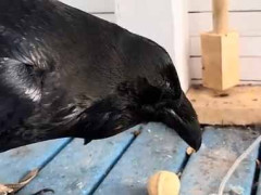 道具を使って木の実を割ろうとする。なかなか割れないなぁ → 賢いカラスはこちらです…
