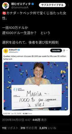 1: 2026/04/07(火) 11:22:22.41 ※関連記事 【画像】シンガポール女さん、宝くじで5億円が当たったと勘違いし全財産を使ってしまい発狂してしまう・・・・…