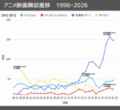 1: 2026/04/07(火) 12:35:45.02 長寿アニメシリーズの主要作品「ドラえもん」「クレヨンしんちゃん」「名探偵コナン」「ポケモン」の過去30年間の興収推移をまとめてみました。※不定期企画の作品は省いています。 pic.twitter.com/xzoXByp77X— ベーダーの興行収入速報 (@mtt_75058) April 6, 2026 ※関連記事 X民「超かぐや姫、着席率96%なのに興行収入が少ない理由がこれらしい」←6万いいね…