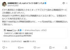 1: 2026/04/07(火) 14:41:11.956 だから集英社とか講談社とかまとまってサブスクで読める漫画配信サービスを開始したほうがいい。月500円でも世界中に配信すれば海賊版もなくなると思うし、全部読まれなくても毎月安定収入だよ。家庭で1000円払えば映画見放題なのに、一ヶ月2000円払って漫画雑誌なんて買わない。 — 自衛隊医官だった人@ハイライトも見てってよ (@AiPinfu2003) April 6, 2026 ※関連記事 【画像】集英社「少年ジャンプの100歳超えキャラ発表しまーす」→結果wwww…