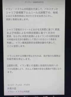 1:2026/04/08(水) 09:26:49.96 ● ?2BP(3000).netイランが一時停戦案を拒否 10項目の対案提示、海峡通航料は「賠償金」【カイロ=古賀雄大、イスタンブール=渡辺夏奈】イランメディアは6日、イランが米国との停戦案について仲介国のパキスタンを通じて拒否したと報じた。10項目の対案を提示し、恒久的な戦闘終結や制裁解除などを求めた。イラン国営通信(IRNA)によると、戦闘終結に向けた10項目の提案をパキスタンに示した。一時的な停戦ではなく恒久的な戦闘停止の必要性を強調した。地域紛争の終結や、ホルムズ海峡の安全航行に関す..(省略)全文アラグチ外相「アメリカがイランが提示した10項目に合意した」Statement on behalf of the Supreme National Security Council of the Islamic Republic of Iran: pic.twitter.com/cEtBNCLnWT— Seyed Abbas Araghchi (@araghchi) April 7, 2026転載元スレッド:…