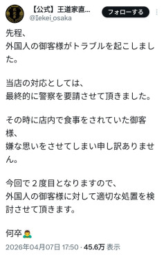 1: それでも動く名無し 2026/04/07(火) 22:23:51.010 2: それでも動く名無し 2026/04/07(火) 22:24:02.416 ちな被害にあった外国人さんの口コミ 3: それでも動く名無し 2026/04/07(火) 22:24:09.484 日本人ファーストやな…
