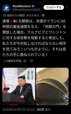 1: それでも動く名無し 2026/04/08(水) 09:47:27.66 ID:BH+GS5hlr 北朝鮮「もしトランプが核兵器使ったら北朝鮮の核ミサイル全弾アメリカにぶち込むぞ!😡」 ↓ トランプ停戦…