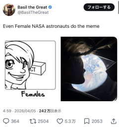 【画像】女さん宇宙飛行士さん「宇宙船から地球撮ってみた👩🏽🚀(パシャ」 海外のお前ら「シュババ!!!」