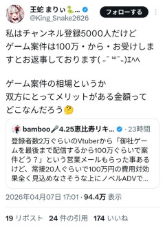 1: 2026/04/08(水) 15:23:18.995 これ、なんで100万かって言うと私には100万の価値があります!って意味ではないです。チャンネル登録も決して多い方では無いしインプレッションも1000いけば良い方なので案件はほぼ来ません。(まじで)… — 王蛇 まりぃ🐍👑新人Vtuber (@King_Snake2626) April 7, 2026 ※関連記事 【悲報】大人気Vtuberさん、未だに炎上が収まらなくて何をしても切れ味鋭く突っ込まれてしまう…