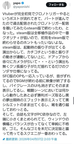 1: 2026/04/09(木) 08:31:28.012 Vtuberが完全初見でクロノトリガーやるというポストが流れてきて、パートが進んでたので過去配信されたクロノトリガー配信を覗いてみたらsteam版で終わったわ、となった。steam版は全移植作品の中で一番クオリティが低いので、初見をsteam版で終わらせるのホントもったいないよな。…— yapo (@yaponishi) April 7, 2026 ※関連記事 【画像】この漫画の「ダメ人間」と付き合っている彼女の話、少し怖くて草wwwww…
