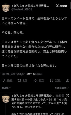 1 名前:名無しさん@おーぷん[] 投稿日:26/04/09(木) 14:18:55 ID:nlkC 2 名前:名無しさん@おーぷん[] 投稿日:26/04/09(木) 14:19:26 ID:slrn サンキューイーロン 4 名前:名無しさん@おーぷん[] 投稿日:26/04/09(木) 14:19:44 ID:FO35 じゃあ海外のホテルで卵かけご飯ズゾゾゾゾしていいんだな? 5 名前:名無しさん@おーぷん[] 投稿日:26/04/09(木) 14:20:11 ID:GlRK ホルホル敗北に我大歓喜 6 名前:名無しさん@おーぷん[] 投稿日:26/04/09(木) 14:20:45 ID:l0cS 鳥刺しとか鳥のタタキを食べるのは日本人だけ これ本当にホント 8 名前:名無しさん@おーぷん[] 投稿日:26/04/09(木) 14:22:03 ID:nlkC…