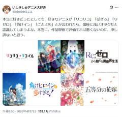 1: 2026/04/09(木) 09:15:57.153 本当に好きだったとしても、好きなアニメが「リコリコ」「ぼざろ」「リゼロ」「負けイン」「ごとよめ」とか言われたら、即座に浅いオタクだと認識してしまうよな。本当に、作品単体で評価すれば悪くないのに、申し訳ないと思う。 pic.twitter.com/sabF7ILGjl— いしきし@アニメ大好き (@ishikishi1111) April 7, 2026 ※関連記事 【画像】アニオタ「わたてんのCD学校で流したらサァ!w」→5年後とんでもないことに…