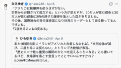 1:muffin ★ 2026/04/08(水) 14:23:51.10 ID:M4RlYO079 「アメリカは核爆弾を使うはずがない。世界から非難されて孤立する」という方が居ますが、30万人が住む都市と20万人が住む都市に2発の原子力爆弾を落とした国がありました。その後、国際連合の常任理事国になり世界のリーダーとして振る舞ってるんですよね。『2度あることは3度ある』 — ひろゆき (@hirox246) April 7, 2026…