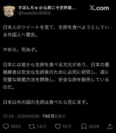 【悲報】X民「生卵を食べれるのは日本だけ!」←海外民から批判殺到www