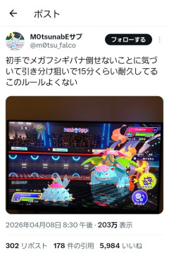 1: 2026/04/10(金) 07:40:43.439 勝ち目無い試合無駄に遅延して批判されてる ※関連記事 【悲報】ポケモンチャンピオンズさん、対戦しかする事なくてつまらなそう…