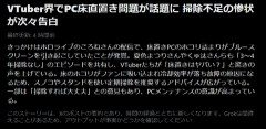 823. 名無しのリスナー VTuber界でPC床直置き問題が話題に 掃除不足の惨状が次々告白 (2026/04/10 07:19:31)きっかけはホロライブのころねさんの配信で、床置きPCのホコリ詰まりがブルースクリーンを引き起こしていたことが発覚。夏色まつりさんやくゅ汰さんらも「3〜4年掃除なし」のエピソードを共有し、VTuberたちが「床置きはヤバい?」と驚きの声を上げている。床のホコリがファンに吸い込まれ冷却効率が落ち故障の原因になるため、スノコやスタンドを使い定期掃除を推奨するアドバイスが広がっている。一部は「掃除すれば大丈夫」との意見もあり、PCメンテナンスの意識が高まっている。 パソコン床に直置き3.4年掃除無しだったまちゅのパソコンは髪の毛とホコリで凄いことになってた買い換えてからデスク上に置いてます😎掃除はよくわかんないからしてない。— 夏色まつり🏮1stアルバム受注開始! (@natsuiromatsuri) April 9, 2026 2026/04/10(金) 09:54:34.69 ID:vQwyryJl 編集元:…