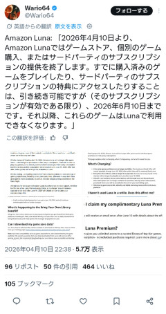 1: 2026/04/10(金) 23:20:53.72 ID:IzFSuSDm0 Amazonは、クラウドゲームサービス「Amazon Luna」について、ゲームの個別購入やサードパーティサブスクリプションの提供などを終了すると発表しました。…