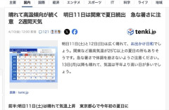 1 : 晴れて高温傾向が続く 明日11日は関東で夏日続出 急な暑さに注意 2週間天気(tenki.jp) - Yahoo!ニュース明日11日(土)と12日(日)は広く晴れて、お出かけ日和でしょう。関東など最高気温が25℃以上の夏日の所もありそうです。急な暑さで体調を崩さないようご注意ください。13日(月)以降も晴れて、気温は平年より高い日が多いでしょう。全文はソースで…