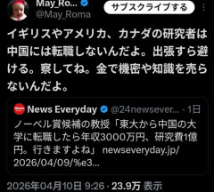 1: ネギ速の名無しさん 2026/04/11(土) 04:26:42.05 ID:SN8znIPt0 金すら出せないから愛想つかされてるんやろw imgur.com/bLfThrc 2: ネギ速の名無しさん 2026/04/11(土) 05:04:34.02 ID:UCBb0eHDH ノーベル賞候補の教授に竹槍で喧嘩売る知性のなさ 3: ネギ速の名無しさん 2026/04/11(土) 04:33:38.87 ID:GQK5C8cV0 個人の能力の使い道に文句言うのは違うよなあ ★よく読まれている記事 【画像】ジャンポケ斉藤の被害女性、ちょっとでかすぎる… 【急募】江戸時代のセクシービデオにありそうなタイトル 二次でこういう画像下さい 【画像】1989のJKがコチラ 【朗報】もう中学生(43)と結婚したタレント(32)、美人すぎる 【画像】女性「婚活市場の普通の男がこれです」←女性が可哀想だと話題に 【画像】NO.1グラビア声優・井口裕香さん、またえちえちボディを青年誌で披露してしまう 【悲報】元TBS宇垣美里(34)「チー牛の告白は暴力。当たって砕けろみたいな告白してくる人が凄い苦手だった」 【画像】美人声優さん、ついに脱ぐ 【動画】例のレベチJC、動画もレベチ 【動画】全財産を勝手に投資に使い大損をこいた嫁、旦那にボコボコにされる 【悲報】専門医「男女で立場に差がある場合、イエスはイエスではない」 【画像】中国美女レイヤーさんのリゼロコスプレ 【悲報】女さん、15歳で出産するのがガチで最強すぎる件 【悲報】夜店の送迎車の中、ワイ以外みんな不細工…