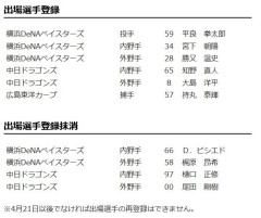1: 名無し 2026/04/11(土) 12:04:11.819 ID:I.sYzKMFF セントラル・リーグ出場選手登録横浜DeNAベイスターズ 投手 59 平良 拳太郎横浜DeNAベイスターズ 内野手 34 宮下 朝陽横浜DeNAベイスターズ 外野手 28 勝又 温史中日ドラゴンズ 内野手 65 知野 直人中日ドラゴンズ 外野手 8 大島 洋平広島東洋カープ 捕手 57 持丸 泰輝出場選手登録抹消横浜DeNAベイスターズ 内野手 66 D.ビシエド横浜DeNAベイスターズ 外野手 58 梶原 昂希中日ドラゴンズ 内野手 97 樋口 正修中日ドラゴンズ 外野手 00 尾田 剛樹※4月21日以後でなければ出場選手の再登録はできません。※ 4: 名無し 2026/04/11(土) 12:04:41.843 ID:m1JLAATXt 尾田くん、お前船降りろ…