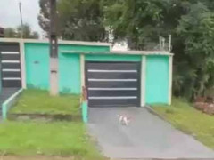 子犬が「ぬいぐるみ」を咥えて走ってきた。とっても楽しそうだ。わ~い♪ → だが、しかし…