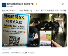 1: 2026/04/12(日) 12:04:26.27 飲食の行列飛ばし、若者「倍払う」 ファストパス利用半数が非リッチ層— 日本経済新聞 電子版(日経電子版) (@nikkei) April 12, 2026 ※関連記事 【悲報】FUJIWARA、バイオハザード実況でストーリーをスキップしまくり炎上→動画削除へwwwwwww…