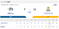 【日本ハムvsソフトバンク 5回戦】スタメン・打順速報|試合実況|4/12 13:00開始
