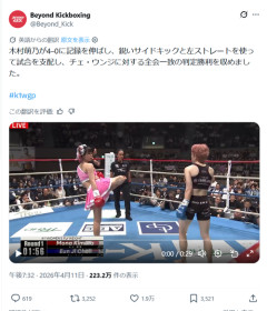 1: 2026/04/12(日) 13:25:56.24 Mona Kimura improved to 4–0, using sharp sidekicks and her left straight to control the fight en route to a unanimous decision against Eun Ji Choi.#k1wgp pic.twitter.com/Trxuju1k2c— Beyond Kickboxing (@Beyond_Kick) April 11, 2026 ※関連記事 春麗「こんなお姉さんでもいいの?」…