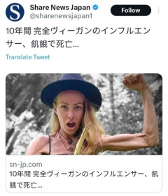 1 名前:名無しさん@涙目です。[] 投稿日:2026/04/08(水) 16:33:26.92 ID:9K+n64iC0 ロシア出身のヴィーガン系インフルエンサー、ジャンナ・サムソノワ(39歳)が、約10年間「生の果物と野菜だけを食べる生活」を続けた結果、2023年7月に餓死したことが明らかになりました。彼女は「ロー・ヴィーガン」として知られ、特に水を一切飲まず、医療機関の受診も拒否していました。 サムソノワはSNSで「Zhanna D’Art」という名前で活動し、インスタグラムでは1万人以上のフォロワーを持ち、健康効果を謳った投稿を行っていました。彼女は「果物とひまわりの芽、果物のスムージーとジュースだけを摂取する」とし、「私の体と心が毎日のように変化している」と信じ込んでいました。しかし、彼女の極端な食生活は健康を害し、最終的には命を落とす結果となりました。 彼女の母親は、サムソノワが「コレラのような感染症」で亡くなったと説明しており、極端な食事制限が症状を悪化させたと述べています。また、知人は彼女が数カ月前に非常に疲れて見え、リンパ液が漏れ出ていたと証言しています。治療を受けるよう説得されても、サムソノワはそれを拒否し続けました。 専門家によると、調理していない野菜ばかりの食事は、減量や心臓病の改善に役立つ可能性がある一方で、カルシウムやビタミンDの不足を招き、栄養失調、貧血、神経系の損傷、不妊などのリスクを高めることが指摘されています。この事件は、極端な食事法がもたらす危険性を再認識させるものであり、健康的な生活を送るためにはバランスの取れた食事が重要であることを示しています。 2 名前:名無しさん@涙目です。[sage] 投稿日:2026/04/08(水) 16:35:01.13 ID:sQLEKbZ80 健康のためなら死んでもいい って事か 183 名前:名無しさん@涙目です。[] 投稿日:2026/04/08(水) 18:57:43.05 ID:ir4JafA+0 >>2 それを地でいく人がいるとはな 196 名前:名無しさん@涙目です。[] 投稿日:2026/04/08(水) 19:32:21.44 ID:yc2kT8yT0 >>2 全然健康でもなかったのになw 253 名前:名無しさん@涙目です。[] 投稿日:2026/04/09(木) 02:46:38.38 ID:/zuLgkqj0 >>2 健康の為じゃなく 命を奪ってまで肉食べる必要ない 野菜や果物だけでもこんなに健康よ! って嘘付いた結果 7 名前:名無しさん@涙目です。[sage] 投稿日:2026/04/08(水) 16:36:33.27 ID:qhG453Eg0 非効率的な自殺 9 名前:名無しさん@涙目です。[] 投稿日:2026/04/08(水) 16:37:00.71 ID:GveZbcaf0 ダーウィン賞かな 5 名前:名無しさん@涙目です。[] 投稿日:2026/04/08(水) 16:35:51.32 ID:CIPcIqOV0 10 名前:名無しさん@涙目です。[] 投稿日:2026/04/08(水) 16:37:26.75 ID:icBasYrS0 >>5 おばあちゃんの腕 34 名前:名無しさん@涙目です。[sage] 投稿日:2026/04/08(水) 16:42:38.65 ID:o0cUwQS50 >>5 不健康にしか見えない 250 名前:名無しさん@涙目です。[] 投稿日:2026/04/09(木) 02:30:25.07 ID:ADFi87jg0 >>5 鏡で自分見て危機感抱いたりしないのかな 285 名前:名無しさん@涙目です。[] 投稿日:2026/04/09(木) 22:07:54.33 ID:jL2jfXCc0 >>5 顔も身体も老婆になってる ロシア人の39歳なら豚おばさんになるのが普通 16 名前:名無しさん@涙目です。[sage] 投稿日:2026/04/08(水) 16:39:11.35 ID:SWkvtbPf0 どっからリンパ液漏れてたんだよ 77 名前:名無しさん@涙目です。[] 投稿日:2026/04/08(水) 17:00:31.37 ID:UqEnP8zD0 >>16 多分皮膚から 低栄養でむくみ過ぎると滲み出てくる事あるし 160 名前:名無しさん@涙目です。[] 投稿日:2026/04/08(水) 18:14:18.04 ID:mQWldlgx0 >>16 タンパク質が足りなくて身体を保てなかったんだろう 飢餓の子が水でお腹膨らむ奴 23 名前:名無しさん@涙目です。[] 投稿日:2026/04/08(水) 16:40:16.03 ID:TWgtB53N0 マッスル北村の死因も餓死だったっけ 41 名前:名無しさん@涙目です。[] 投稿日:2026/04/08(水) 16:45:38.45 ID:CIPcIqOV0 58 名前:名無しさん@涙目です。[] 投稿日:2026/04/08(水) 16:51:50.63 ID:VmkGyS/10 >>41 牛乳飲んでたら糖不足にはならないと思うが 無糖牛乳だったんかな? 93 名前:名無しさん@涙目です。[] 投稿日:2026/04/08(水) 17:08:13.02 ID:T8doavGR0 >>58 牛乳はそれ程糖質入ってない おまけにミネラル不足も重なって糖質が入っても代謝する事が出来なくなってた 24 名前:名無しさん@涙目です。[sage] 投稿日:2026/04/08(水) 16:40:17.73 ID:tWaVVICW0 偉いやん チートデイとか馬鹿ぶっこいて肉食べてる偽物が大半だろうし 22 名前:名無しさん@涙目です。[] 投稿日:2026/04/08(水) 16:40:11.25 ID:YaaDUzWA0 他人に迷惑かけないだけマシな人だったんじゃね 88 名前:名無しさん@涙目です。[sage] 投稿日:2026/04/08(水) 17:05:50.62 ID:c9m1ui320 >>22 ヒント:インフルエンサー 42 名前:名無しさん@涙目です。[] 投稿日:2026/04/08(水) 16:45:42.66 ID:zNPafIB90 栄養不足なのは明らかだもんな 勧めてるやつは殺人者みたいなもんだぞ 25 名前:名無しさん@涙目です。[] 投稿日:2026/04/08(水) 16:40:29.96 ID:Y46aztkM0 アホじゃんw まあそれが望んだ結果なんだろう バカの考えることは良く分からねーけどw 51 名前:名無しさん@涙目です。[sage] 投稿日:2026/04/08(水) 16:47:37.51 ID:kaHfJSix0 なんでそこまでして拒否するんだろうな 生き過ぎた動物愛護精神なのかもはや引くに引けなくなっただけなのか 52 名前:名無しさ