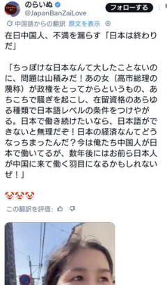 1: ネギ速の名無しさん 2026/04/13(月) 10:23:04.66 ID:+yq+Irom0 imgur.com/pssiCHR 2: ネギ速の名無しさん 2026/04/13(月) 10:49:34.53 ID:ebjapoSG0 中国って日本語しか話せなくても働けんの?最先端やな 3: ネギ速の名無しさん 2026/04/13(月) 10:23:22.41 ID:+yq+Irom0 排他的すぎるよ ★よく読まれている記事 【画像】オタクくん、女の服の構造がわからない… 【動画】大谷翔平、女性差別してガチ炎上 【衝撃】もう中学生(43)と結婚したタレント、美人すぎると話題に 【画像】女さん「え、まって。男の会話………つまんな」 【画像】杉本彩さん(57)、完全に近所のマダムと化してしまう 【動画】JC13歳、初めての脇脱毛 【動画】強者男性、つばを吐いてきた女に制裁を加える 【衝撃】アメリカの美女排泄インフルエンサー、家電に尿をかけて訴えられる 【動画】チビ女さん、暴力でホストを一方的に追い詰めてしまう 【画像】セクシー女優さん、アイドルと比べられてお気持ち表明 【画像】こんなお尻で爆買いする、セクシーセレブ現る 【画像】女性声優、舞台で共演したイケメンたちと写真を撮りまくってしまう 【画像】女の子が行為の後にして欲しいことがこちら 【画像】広瀬すずの私服、ヤバい 【画像】現役女子バレー選手、ちょっとセクシーが過ぎる…