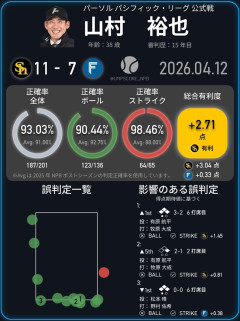 1: 名無し 2026/04/13(月) 15:56:41.157 ID:OBoHRG08f NPB Umpire Score@umpscore_npbパーソル パシフィック・リーグ 公式戦球審:山村裕也結果:福岡ソフトバンク 11-7 北海道日本ハム#sbhawks // #lovefightersCheck ALT for the ENGLISH version.(Format based on Umpire Scorecards. Not Official.) 3: 名無し 2026/04/13(月) 15:58:08.867 ID:HIk0K95kR 有能…